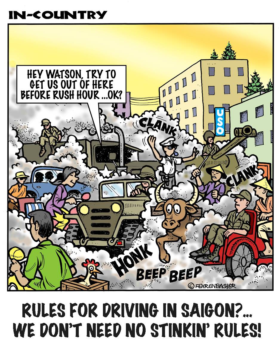 Phil enlisted in the Army in 1965 where you served for years in Vietnam. He became a graphic designer and has worked for the state of Oregon for 26 years. He retired in 2003 and started the Cartoon "In-Country". The cartoons reflect his experiences during his tour of duty in South Vietnam.